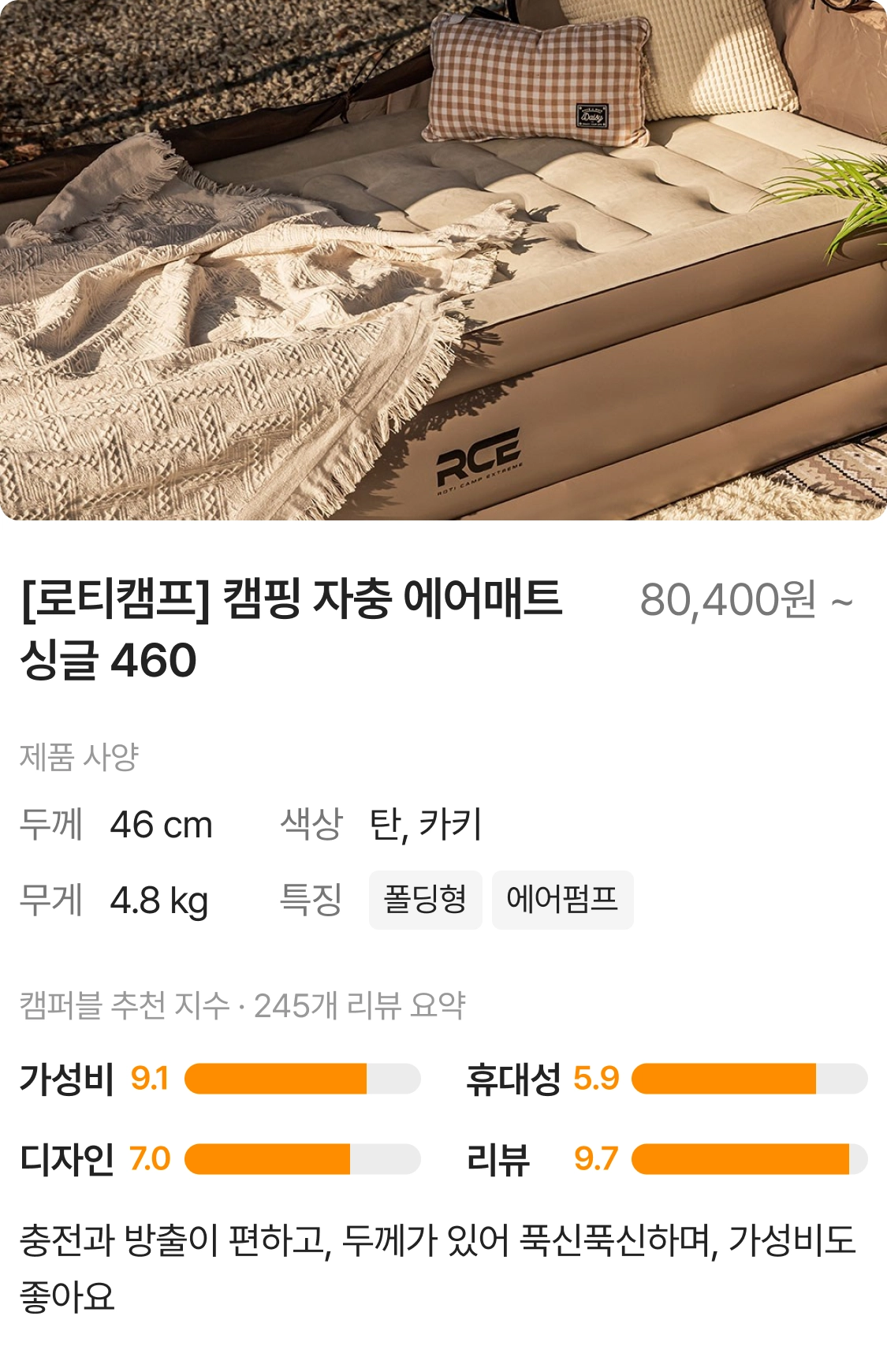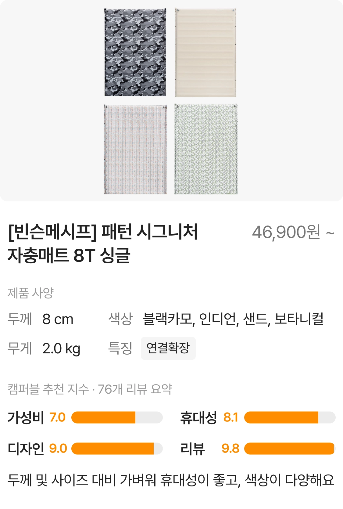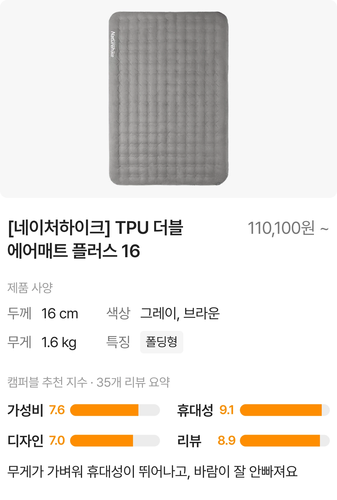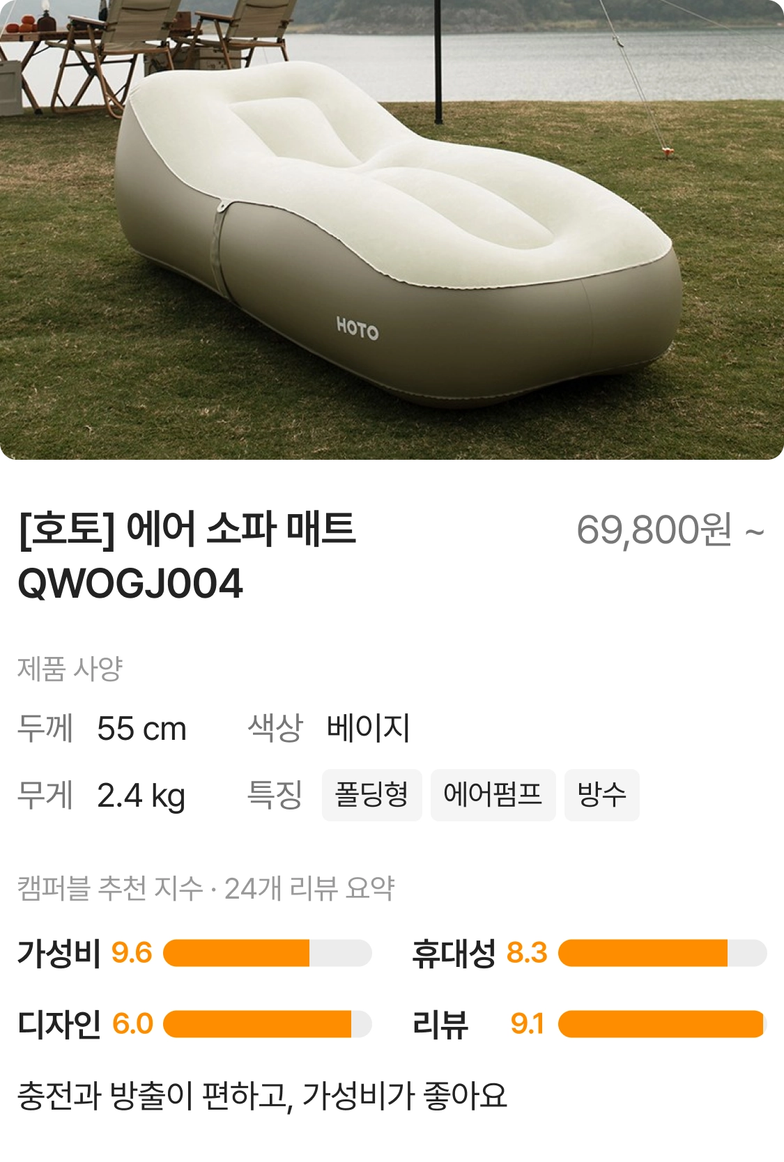 캠퍼블이 블로그, 카페, 쇼핑몰 리뷰를 모두 모아 (1) 사용성, (2) 휴대성, (3) 가성비, (4) 디자인 4가지 기준으로 분석&점수화한 지표에요. 캠퍼블 랭킹 Top10 상품을 추천해 드릴게요!