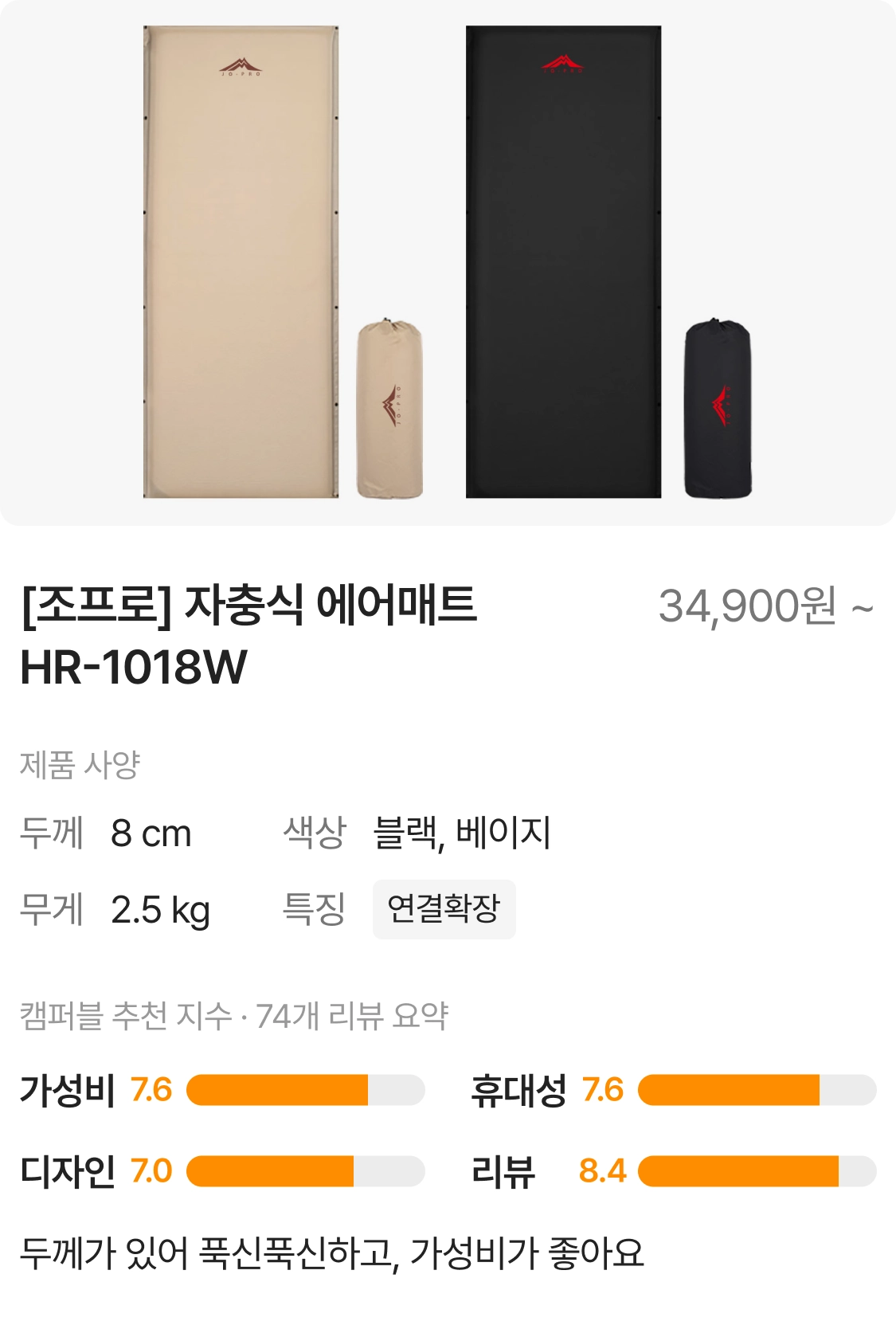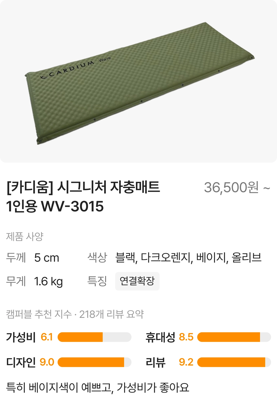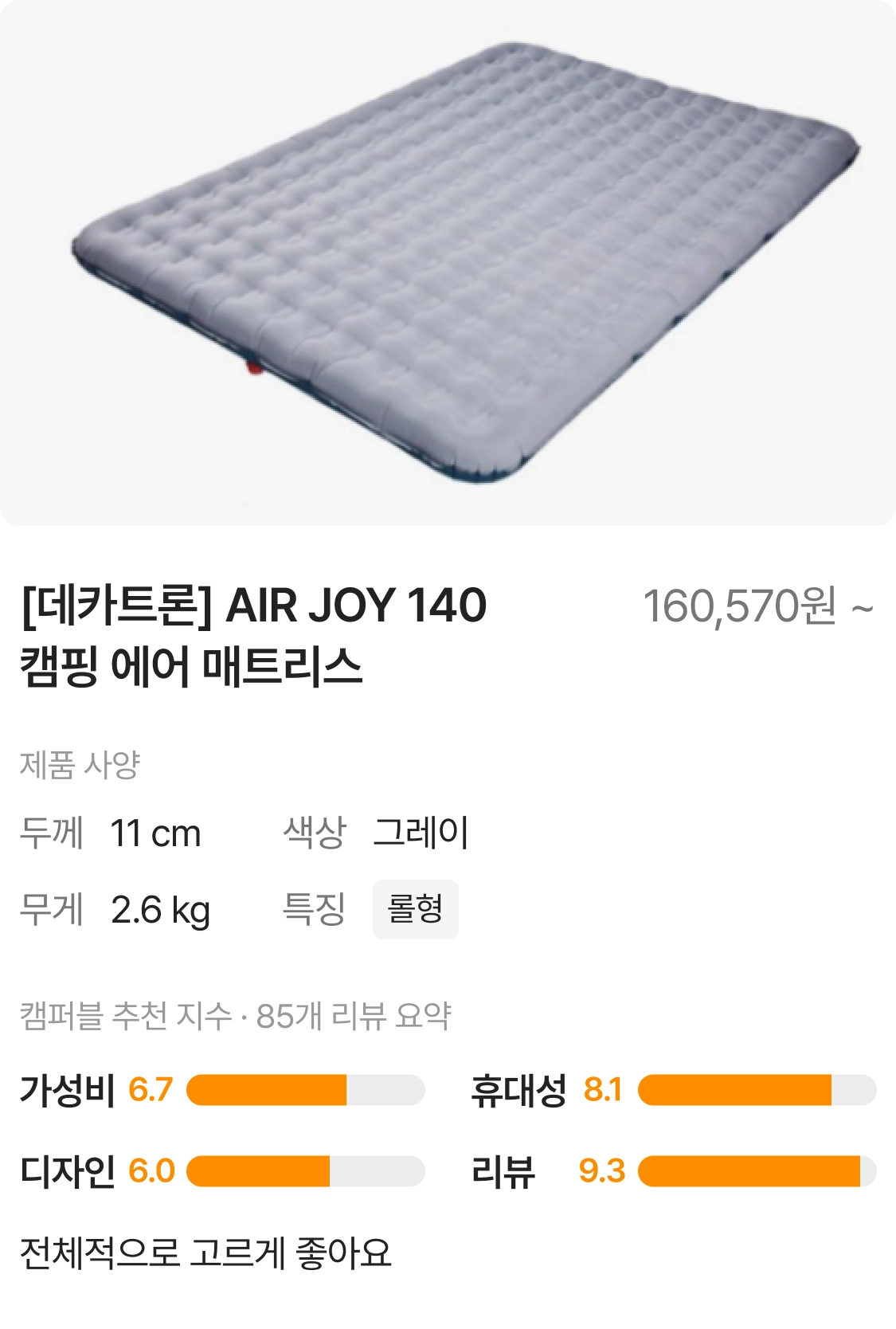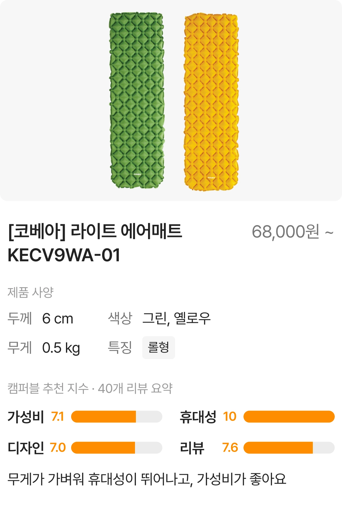 장점 : 푹신함을 유지해주는 충전재가 들어 있어 편하고 R Value도 보통 6 이상이에요.