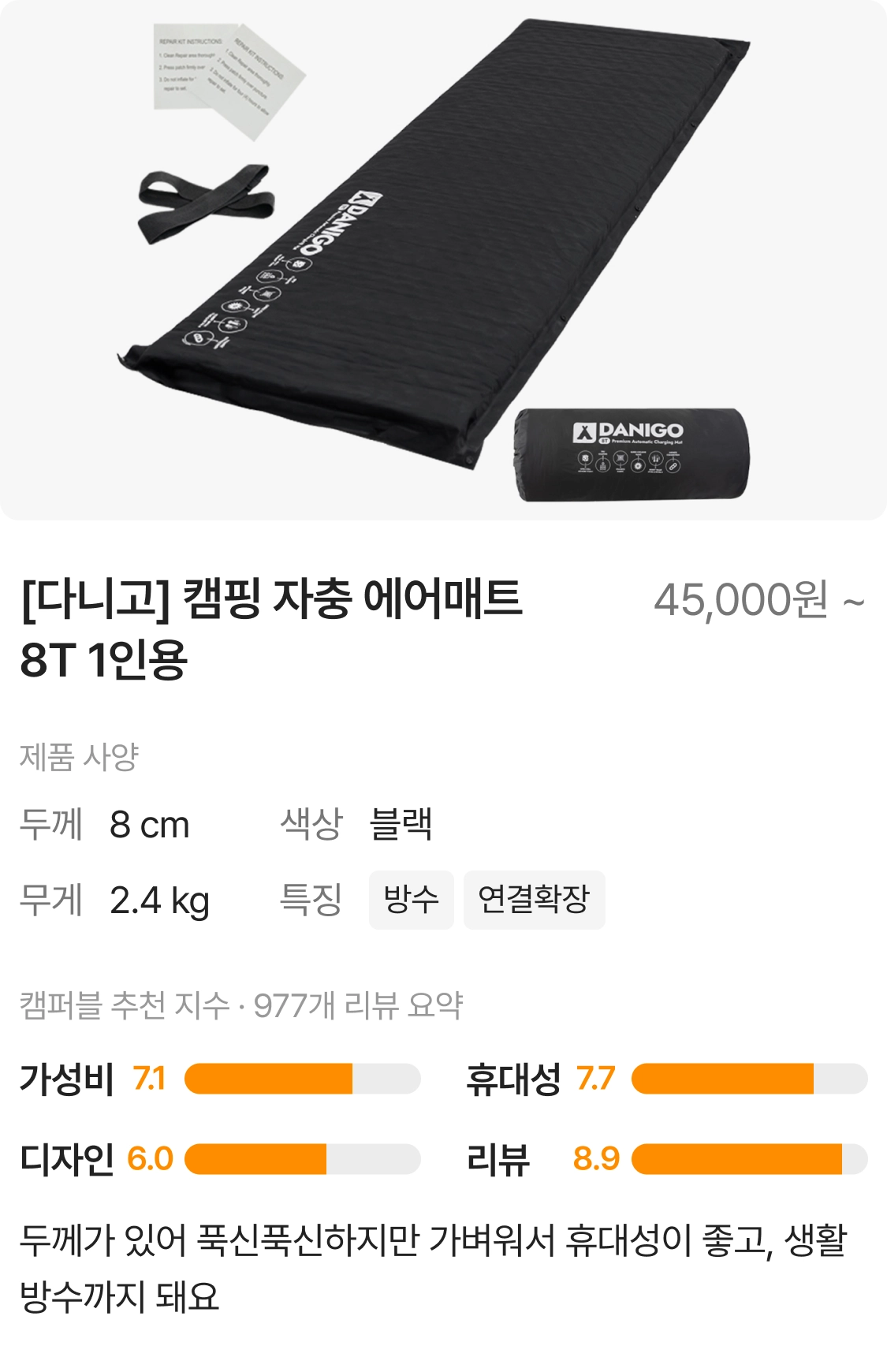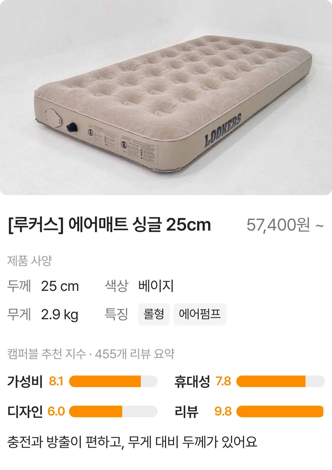 단점 : 저절로 공기 충전 하기에는 시간이 오래 걸려 에어펌프를 함께 사용해야 해요.