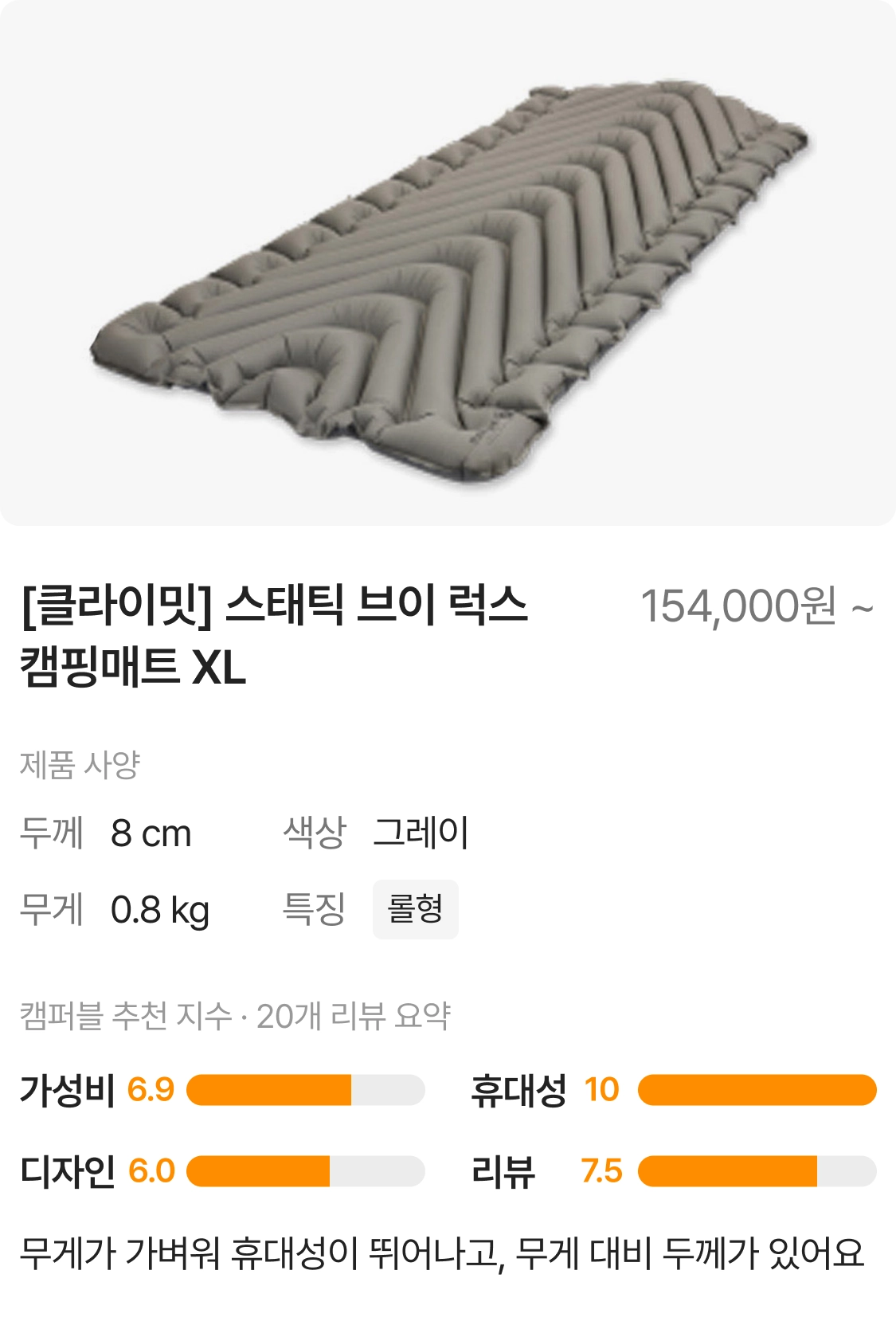 매트를 사용할 수 있는 최저 온도를 나타내며, 겨울 캠핑이 필요할 경우 영하 18도 추위까지 견딜 수 있는 R Value 5 이상의 제품을 선택하는 것이 중요해요.